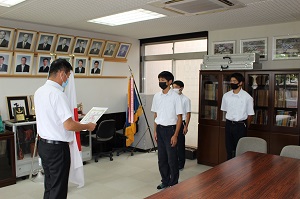 本校の情報電子科3年髙野真櫻さんが受賞し、熊本県知事の蒲島郁夫様から直接表彰状を頂きました。