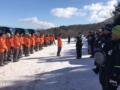スキー場に到着しました。積雪も十分のようです。バスから降りて、開校式が行われました。開校式では生徒代表の設備工業科1年 塚本君が「 皆、初めてのスキーですが、インストラクターの指導に従って2日間でしっかりと滑れるように頑張ります 」と挨拶をしました。記念撮影も終わり、早速インストラクターの指導が始まりました。