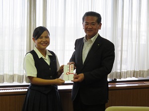 9月16日(金)に、熊本県教育委員会主催の海外インターンシップ事業アメリカへ派遣の件で、機械科2年生の沖田さんが、同窓会会長で八代市長の中村様を表敬訪問させていただきました。