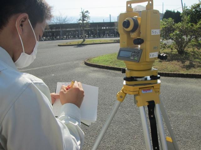 1年生の授業「工業技術基礎」での、トラバース測量実習の様子です。測量作業は、その地域の特徴や形状を知るためにとても重要な仕事です。トラバース測量ではセオドライト(トランシット)と呼ばれる測量器械で、現場の角度を測ります。