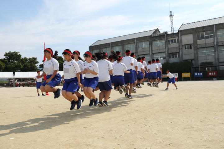 橋役の生徒が1列に並び、その背中の上を1人の生徒が走っていきます。