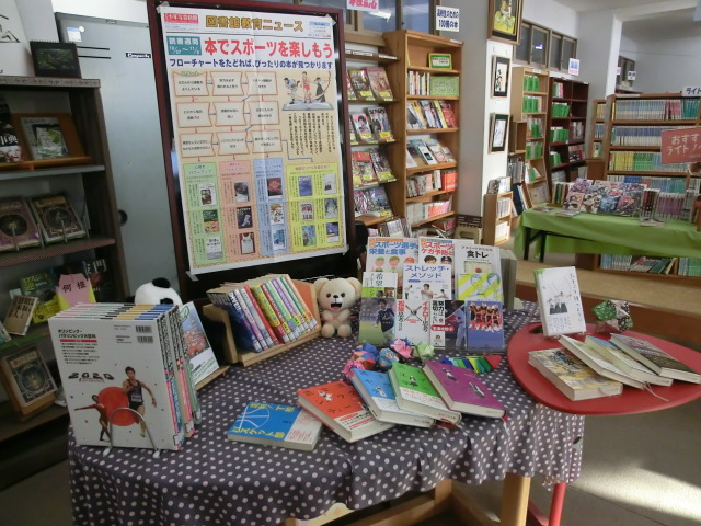 今月のテーマ展示は「本でスポーツを楽しもう」です。