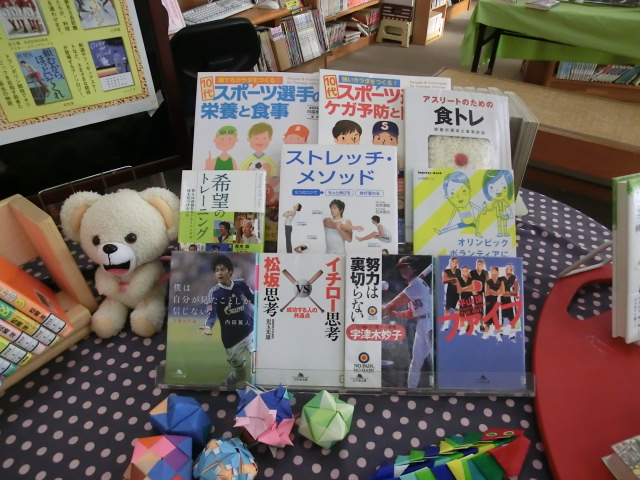 スポーツをテーマにした小説の他、トレーニングやノンフィクションの本を展示しています。