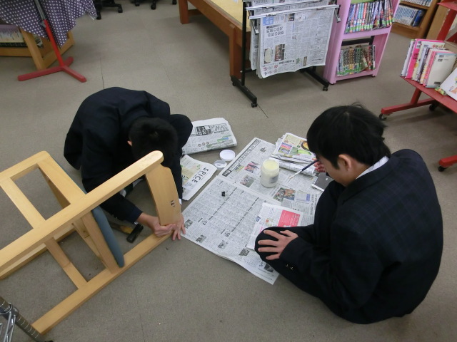 図書館の椅子がぐらいついていたので、建築科の図書委員に修理を頼んでみました。