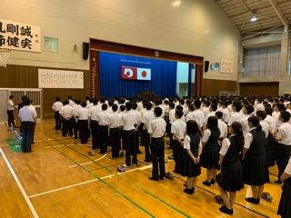 本日から4日間の日程で1年生が修学旅行に出発しました。病気等もなく、全員が朝7時30分の出発式に参加し、8時15分本校を出発しました。