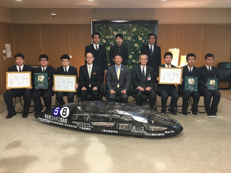 速報でもお知らせいたしましたが、’19エコデンレースで「バッテリー部門優勝」「充電池部門優勝・3位」という素晴らしい成績をおさめた機械工作部の3年生が小野熊本県副知事に大会結果の報告をさせていただきました。