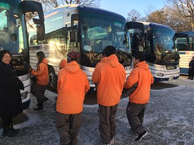 スキー研修を終え、各科バスでスカイツリーへ移動中です。