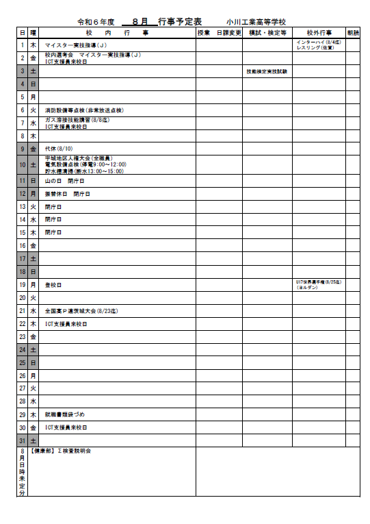 学校行事 全ての記事 全ての記事 カテゴリ 今日の出来事 連絡事項 報告事項 ミーティング 本・雑誌 ニュース 映画・テレビ 音楽 スポーツ パソコン・インターネット ペット 総合学習 アニメ・コミック アーカイブ 2025年12月 (0) 2025年11月 (1) 2025年10月 (1) 2025年9月 (2) 2025年8月 (0) 2025年7月 (1) 2025年6月 (1) 2025年5月 (0) 2025年4月 (2) 2025年3月 (0) 2025年2月 (1) 2025年1月 (1) 2024年12月 (1) 2024年11月 (1) 2024年10月 (1) 2024年9月 (1) 2024年8月 (1) 2024年7月 (1) 2024年6月 (1) 2024年5月 (1) 2024年4月 (2) 2024年3月 (0) 2024年2月 (1) 2024年1月 (1) 2023年12月 (1) 2023年11月 (1) 2023年10月 (1) 2023年9月 (1) 2023年8月 (1) 2023年7月 (1) 2023年6月 (3) 2023年5月 (1) 2023年4月 (2) 2023年3月 (0) 2023年2月 (1) 2023年1月 (1) 2022年12月 (1) 2022年11月 (1) 2022年10月 (1) 2022年9月 (1) 2022年8月 (1) 2022年7月 (0) 2022年6月 (1) 2022年5月 (1) 2022年4月 (2) 2022年3月 (0) 2022年2月 (1) 2022年1月 (1) 2021年12月 (1) 2021年11月 (1) 2021年10月 (1) 2021年9月 (1) 2021年8月 (1) 2021年7月 (1) 2021年6月 (1) 2021年5月 (1) 2021年4月 (2) 2021年3月 (0) 2021年2月 (1) 2021年1月 (1) 2020年12月 (1) 2020年11月 (1) 2020年10月 (1) 2020年9月 (1) 2020年8月 (1) 2020年7月 (1) 2020年6月 (2) 2020年5月 (0) 2020年4月 (1) 2020年3月 (0) 2020年2月 (0) 2020年1月 (0) 2019年12月 (0) 2019年11月 (0) 2019年10月 (0) 2019年9月 (0) 2019年8月 (0) 2019年7月 (0) 2019年6月 (0) 2019年5月 (0) 2019年4月 (1) 2019年3月 (0) 2019年2月 (1) 2019年1月 (0) 2018年12月 (1) 2018年11月 (0) 2018年10月 (1) 2018年9月 (0) 2018年8月 (1) 2018年7月 (0) 2018年6月 (1) 2018年5月 (1) 2018年4月 (2) 2018年3月 (0) 2018年2月 (1) 2018年1月 (1) 10件 1件 5件 10件 20件 50件 100件 1月行事予定 投稿日時 : 2024/12/19 学校サイト管理者 1月行事予定を追加しました。令和6年度1月行事予定 12月行事予定 投稿日時 : 2024/11/27 学校サイト管理者 12月行事予定を追加しました。 令和6年度12月行事予定 11月行事予定 投稿日時 : 2024/10/21 学校サイト管理者 11月行事予定を追加しました。 令和6年度11月行事予定 10月行事予定 投稿日時 : 2024/09/19 学校サイト管理者 10月行事予定を追加しました。 令和6年度10月行事予定 2学期並びに9月行事予定 投稿日時 : 2024/08/21 学校サイト管理者 令和6年度2学期行事予定.pdf 令和6年度9月行事予定.pdf 8月行事予定 投稿日時 : 2024/07/16 学校サイト管理者 8月行事予定を追加しました。 令和6年度8月行事予定 7月行事予定 投稿日時 : 2024/06/20 学校サイト管理者 7月行事予定を追加しました。 令和6年度7月行事予定 6月行事予定 投稿日時 : 2024/05/20 学校サイト管理者 6月行事予定を追加しました。令和6年度6月行事予定 5月行事予定 投稿日時 : 2024/04/18 学校サイト管理者 5月行事予定を追加しました。 令和6年度5月行事予定 4月行事予定 投稿日時 : 2024/04/05 学校サイト管理者 4月行事予定を追加しました。 令和6年度4月行事予定 « 12345678 »