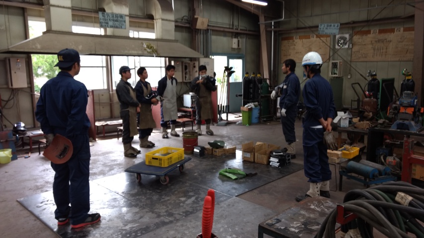 永井製作所様より、現場で働いている2名の講師に来ていただき、溶接の指導をしていただいています。