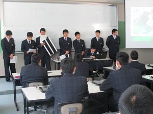 EVカー製作班、貢献品製作班の5班に分かれ活動し、1年間の研究成果を1、2年生の前で発表しました。