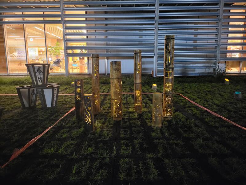 10月26日(土)に不知火美術館・図書館中庭で開催された宇城市商工会青年部主催の「うきあかり」に本校建築科で制作した竹灯籠を展示した。