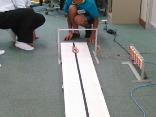 プログラミングしコースで試走を行いながら、ロボットカーが速く走るよう調整しています。