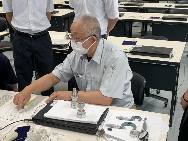 先週からものづくりマイスターの加藤先生に来ていただき、機械検査作業の実技講習を機械科2年生の生徒6名が受講しました。機械検査は製品を測定する能力が問われる試験でマイクロメーターやノギス、シリンダゲージという測定機器を使用し、1/1000mmの単位まで読み取ります。測定あっての加工技術!確かな技術を習得してもらいたいです。