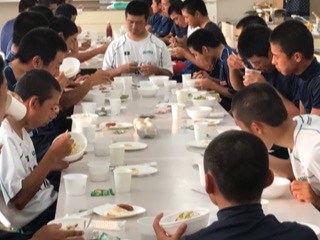 合宿2日目、今日も朝食をみんなでしっかりと食べて、練習に励んでいます。部員一同団結し、