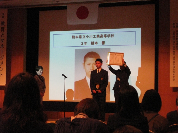 11月17日(土)にくまもと県民交流館パレアで開催された平成30年度「くまもと教育の日」県民フォーラムの中で、公立学校善行児童生徒表彰が行われました。今年は本校建築科3年の橋本君が7月に人命救助を行った功績が評価され、宮尾千加子教育長より表彰状を授与されました。