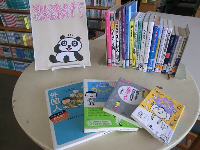 【図書館】ミニ展示 投稿日時 : 2017/09/21 図書 昨日行われた健康教育講話にあわせて、ミニ展示コーナーを作りました。講演の中で紹介された本や、人生訓・ストレスに関する本などを展示しています。読みやすい本が多いので、気分転換にいかがでしょうか?