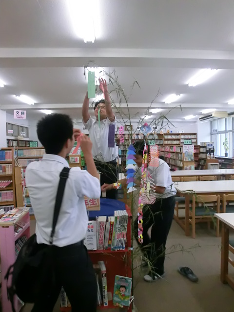 図書館に立ち寄った生徒たちは、早速短冊に願い事を書いていました。
