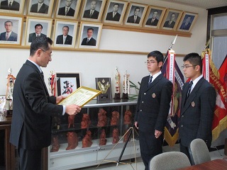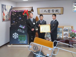これは、本校機械工作部による被災地へのリヤカー贈呈と、情報電子科の生徒によるイオンモール宇城へのクリスマスイルミネーション展示への表彰です。