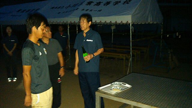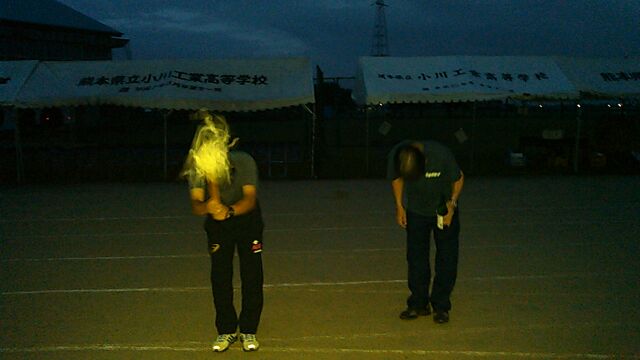 体育大会当日朝のグラウンド清め式 投稿日時 : 2017/10/07 管理職 予想もしなかった夜中の雨で心配しましたが、大会当日朝5時半に校長先生をはじめ関係者が集まり、大会の実施について協議した結果、「本日予定通りに実施する」と校長先生から御決裁(決定)をいただきました。その後、生徒達の安全を祈願するための伝統のグラウンド清め式を行った後、6時丁度に爆竹を上げいよいよ第43回体育大会が幕開けされました。