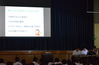 生徒総会が行われました。 投稿日時 : 2017/06/16 学校サイト管理者 生徒総会が行われました。各委員会より、委員会活動の内容やお願いの発表が行われました。電車でのマナーや、トイレの使用方法、挨拶の大切さなどがありました。どの委員会からも学校を良くしようという気持ちが伝わりました。