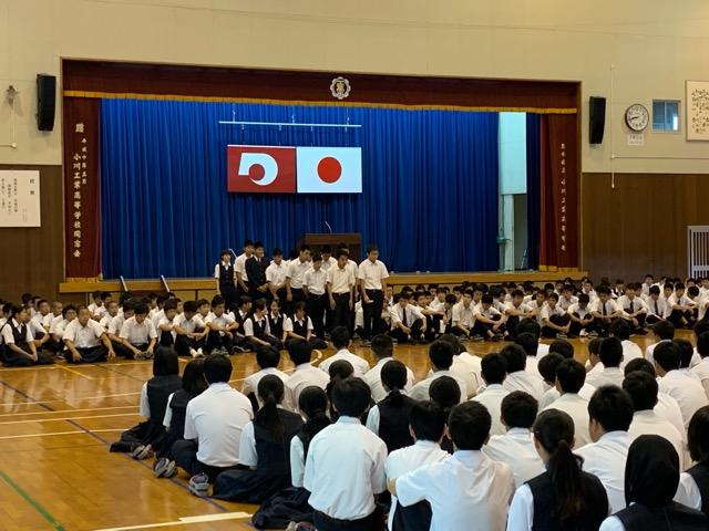 いよいよ高校総体・総文祭が始まります。5月24日(金)、選手推戴式を行いました。本校からは14の競技に175人の選手が出場します。推戴式では、総体の総合開会式で旗手を務める陸上部の本田さんに校長先生から校旗が手渡され、各部活動の主将からは競技日程や抱負が発表されました。最後に選手の健闘を祈って全校生徒で校歌を斉唱しました。総体・総文の開会式は5月31日(金)に行われますが、サッカー、テニス、ソフトテニス等の先行競技は、明日から試合が始まります。小川工高生の活躍を期待します。