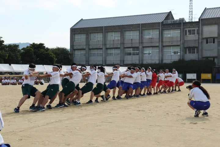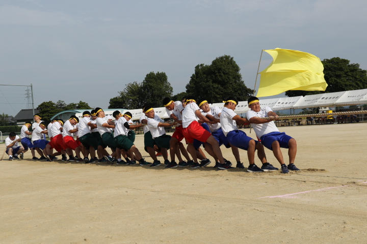 体育大会 綱引き 投稿日時 : 2020/10/03 学校サイト管理者 3番目の競技綱引きが行われました。 各クラストーナメント形式で争います。 文字通り一歩も引かない激戦が繰り広げられました。 1位は設備工業科でした。
