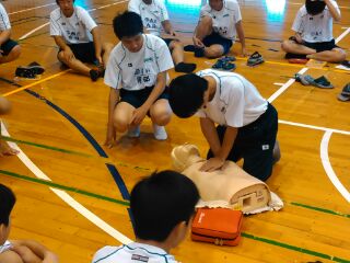 救急法講習会 投稿日時 : 2018/07/04 管理職 7月3日(火)宇城広域消防署小川分署より救急法講習会を実施していただく予定でしたが、隊員の皆様が台風接近のためにおいでいただけなくなりました。そこで本校体育科職員により、予定通り実施することになりました。生徒達はとても真剣に参加し、実技を学ぶことができました。