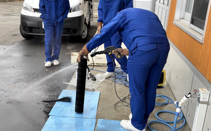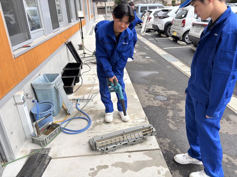 高圧洗浄機で洗浄しました。分解した後はまた自分たちで組み立てていく作業をしました。