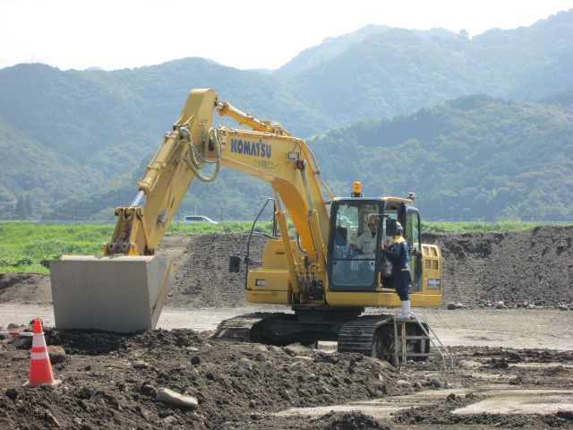 上益城郡甲佐町にある緑川環境整備工事を見学しました。スマートコンストラクション(情報通信技術を工事現場に活用する最先端のシステム)を実際に取り入れられている現場で、システムについて学んだ後、実際に体験させてもらいました。