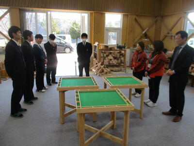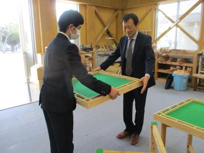 昨年度に引き続き宇城市社会福祉協議会から依頼を受け、本校建築科3年生6名により、健康マージャン卓3台を制作し、 1月16日(金)に贈呈しました。今後は、地区公民館で活用される予定です。