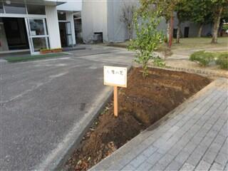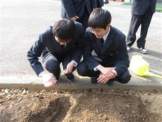 生徒昇降口横の2つの花壇に、花の種をまきました。この花壇は、昨年度にボランティア委員の呼び掛けにより集まった生徒達が開墾したものです。今回も、参加の呼び掛けをしたところ、ボランティア委員2名を含む16名の生徒達が参加しました。