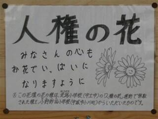 「人権の花」のバトンによって、小川工業高等学校も学校全体が笑顔でいっぱいになることを願って、「みなさんの心も お花でいっぱいに なりますように」と生徒が書いた紙を看板に貼って立てました。これから、毎日水やりをしながら、発芽するのを楽しみにしています。