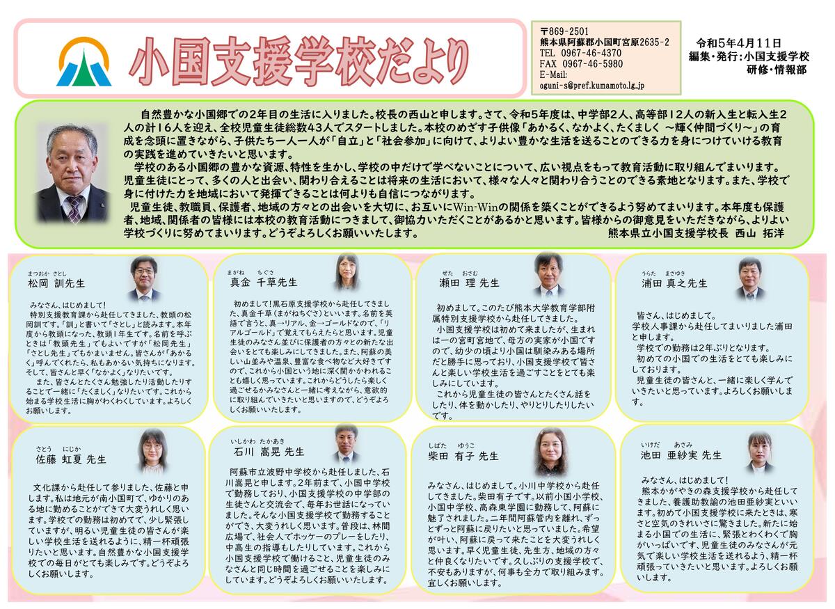 自然豊かな小国郷での2年目の生活に入りました。校長の西山と申します。さて、令和5年度は、中学部2人、高等部12人の新入生と転入生2人の計16人を迎え、全校児童生徒総数43人でスタートしました。本校のめざす子供像「あかるく、なかよく、たくましく ~輝く仲間づくり~」の育成を念頭に置きながら、子供たち一人一人が「自立」と「社会参加」に向けて、よりよい豊かな生活を送ることのできる力を身につけていける教育の実践を進めていきたいと思います。