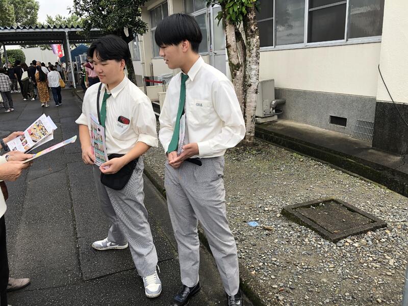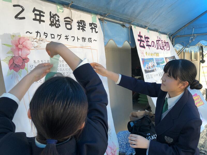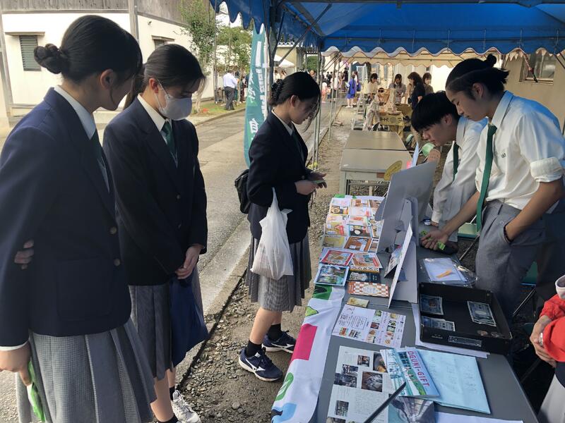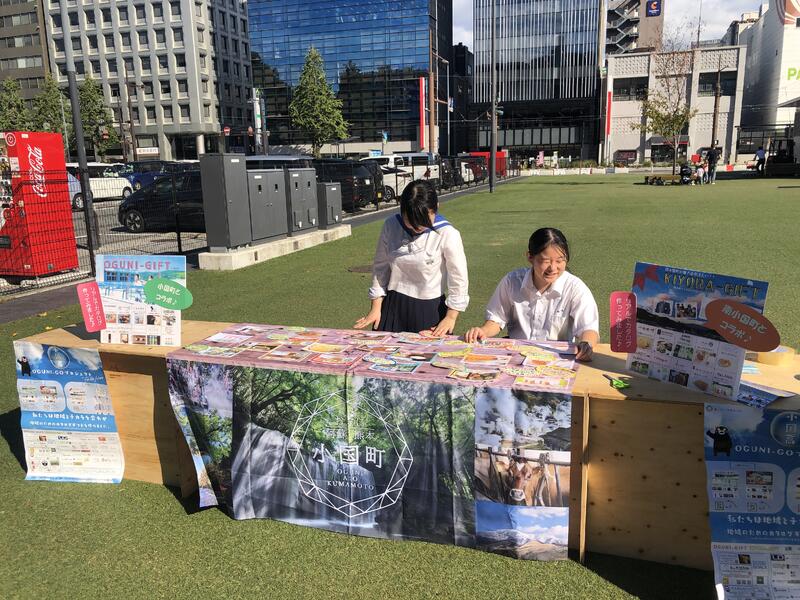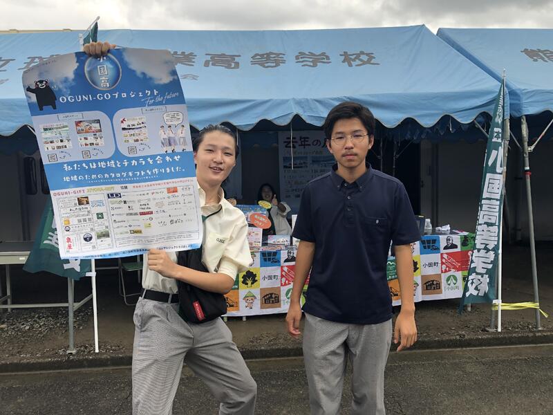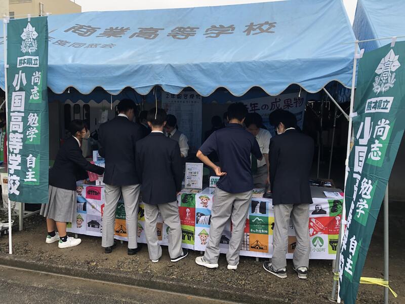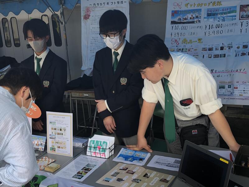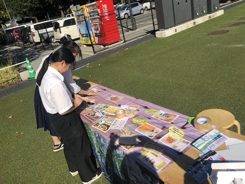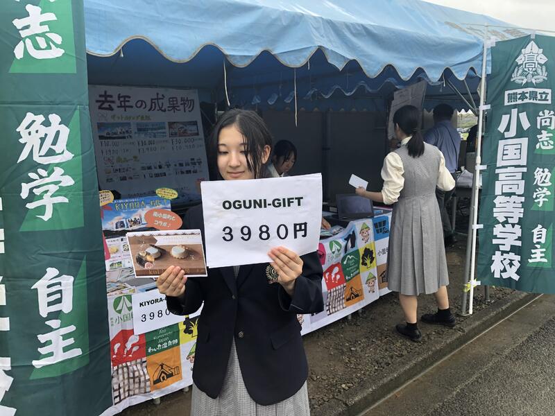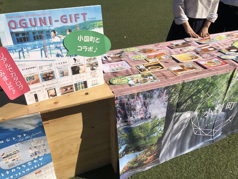 2年生が総合的な探究の時間で取り組む「OGUNI‐GOプロジェクト」で制作している地域貢献型カタログギフト「OGUNI-GIFT」、「KIYORA‐GIFT」とカタログギフト掲載商品である入浴剤「湯気の森」を販売してきました。また、ASOおぐに観光協会の方から預かった小国町の観光パンフレットも配布しました。