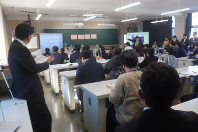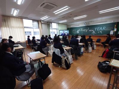 11月25日に本校化学室で留学情報交換会を開催しました。当日は、熊本県留学支援員の坂口マコ様に講師として御来校いただき、留学制度や奨学金制度に関する説明を行っていただきました。参加した生徒からは、「留学したいという思いが強くなった。」「まずは実用英語技能検定を取得しなければならない。」といった声が聞かれ、グローバルな視点からキャリアに対する理解が深められたのではないかと思います。卒業生の中には、海外の大学へ進学している生徒もおり、学校として今後も生徒の多様な進路選択に対応していきます。