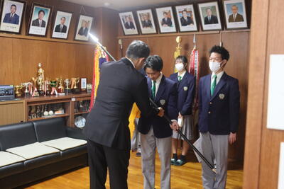 河津酒造株式会社代表取締役会長の河津悦雄さまより、ウィンドチャイムとピッコロをご寄贈いただき、代表として吹奏楽部2年生に手渡されました。