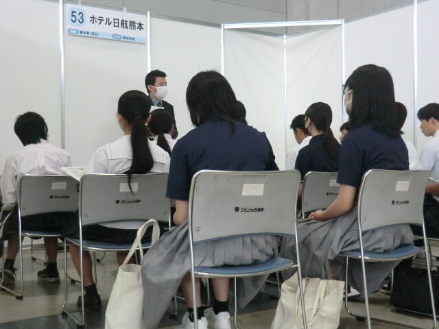 熊本の製造業、建設業、サービス業など総勢62社が出展する中、自身の就職希望先を中心に、複数のブースに行き、積極的に情報を収集していました。熊本の企業の魅力を知るだけでなく、「どういう人材が求められているのか」を直接企業から伺うよい機会となりました。