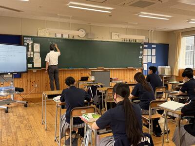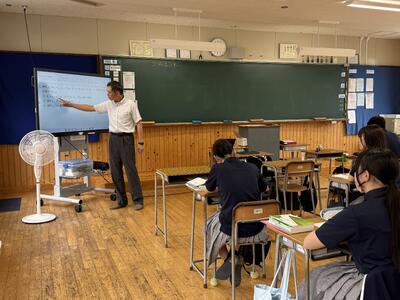 6月12日(木)には、3年1組文系に数学の授業の配信をしている第一高校の先生に、対面で授業をしていただく「スクーリング」が行われました。