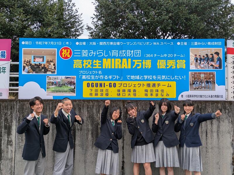 3年生6名が昨年度から、総合的な探究の時間での取組「OGUNI-GOプロジェクト(OGUNI-GIFT、KIYORA-GIFTの製作と販売)」で「高校生MIRAI万博」というコンテストにエントリーし、書類審査と動画選考・オンラインプレゼンテーションにより全364チームからベスト20に選考され、優秀賞を受賞すると同時に大阪・関西万博で発表することが決定しました!7月31日(木)午後にウーマンズパビブリオン「WA」スペースで発表します!良い準備をして、全力で頑張ってきたいと思います。