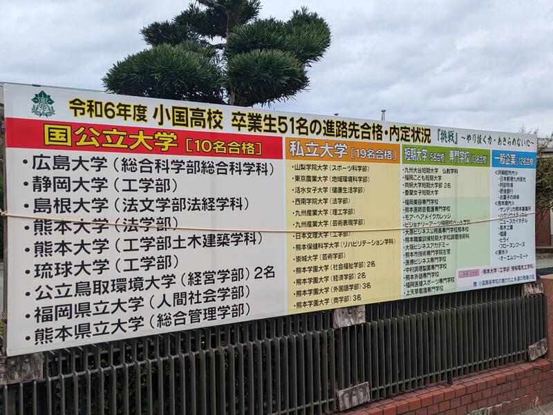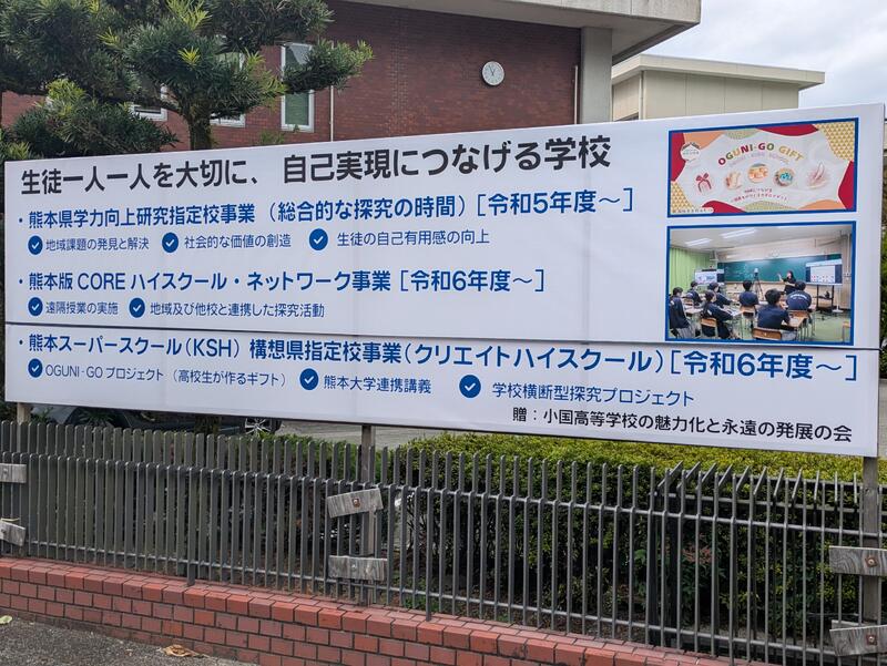 さらに、正門前には「総合的な探究の時間」に関する研究指定等の看板が、輝かしい進路実績の看板と並んで登場!