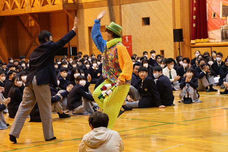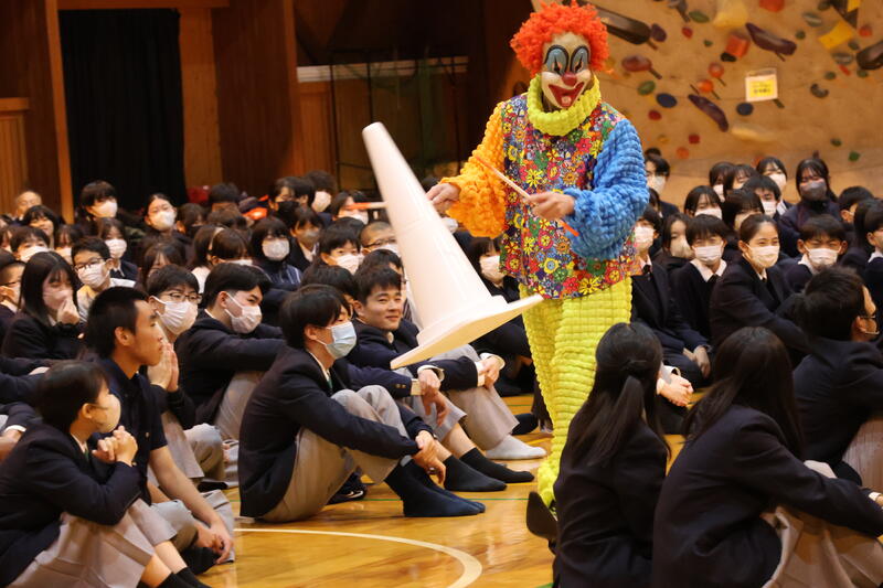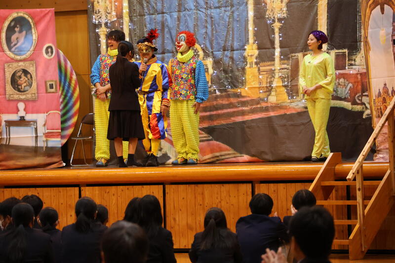 今年度は、日本芸術教育振興会の皆さんによる 「TOKYOスーパーイリュージョン」 を鑑賞しました。光と音を駆使した迫力あるステージは圧巻で、マジックやイリュージョンのほか、心理学ショー、ピエロのパフォーマンス、科学実験など多彩な内容が次々に展開されました。中でも、生徒がステージに招かれて出演者と一緒にパフォーマンスを体験する場面では、会場が一気に盛り上がり、驚きと歓声、そして笑顔があふれ、皆が芸術の楽しさを体感していました。