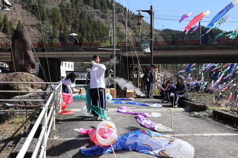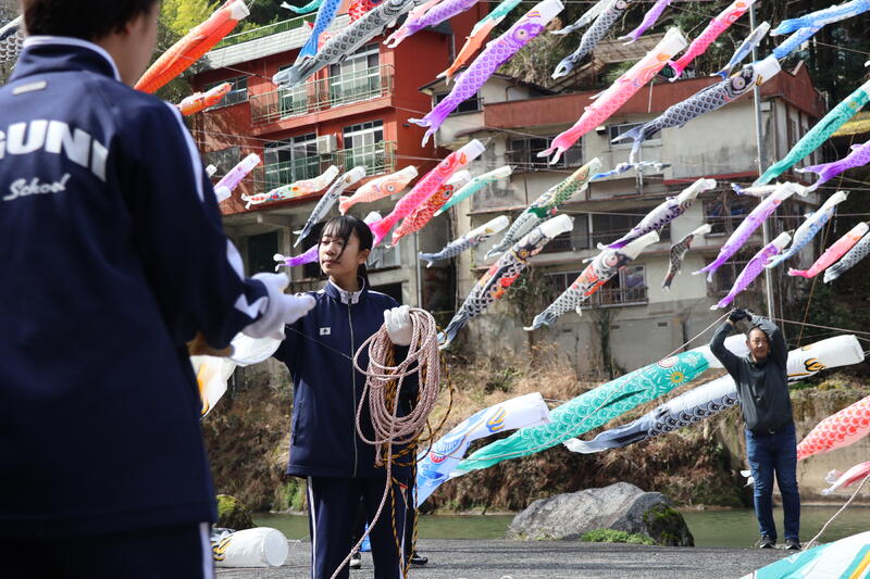 3月26日(木)、杖立温泉で行われた鯉のぼり上げのボランティアに参加しました。小国高校生がこのボランティアに参加するのは、今年で6回目となります。今回は中高一貫教育連携校でもある小国中学校の生徒もボランティアに参加し、中学生と高校生が協力して作業を進める場面がみられました。