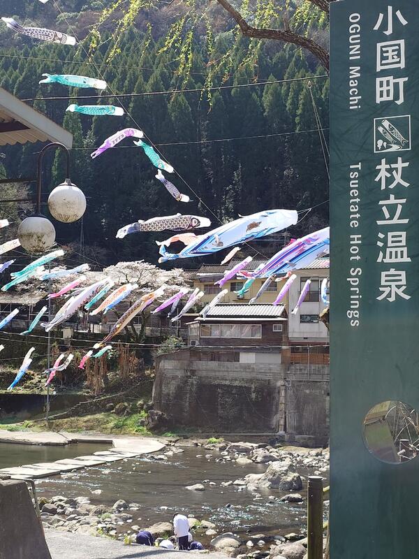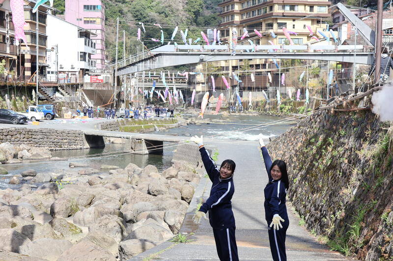 作業開始から約6時間、最後には色とりどりの鯉のぼりが川の上を彩りました。生徒たちが心を込めて上げた鯉のぼりが、杖立温泉の春の風に揺れています。訪れる皆さんに、ゆっくりとお楽しみいただければと思います!