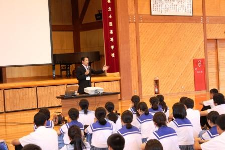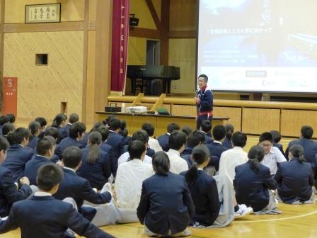 本日、5・6限目に人権教育講演会が行われました。元エアロビック競技日本代表で日本エアロビック連盟の理事をされている、大村詠一さんが講演をしてくださいました。1型糖尿病やエアロビックを個性ととらえたご自身の経験で学ばれた、多くの前向きな言葉を紹介して頂きました。