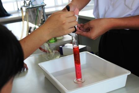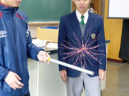 テープとシャボン玉を静電気でどれだけ浮かせられるかですが、物理のT先生があまりにも簡単に実演されるので、誰でもできると思いきや、甘い!かなり悪戦苦闘・・・。でも、面白い!大多数が苦手意識を持ってしまう物理ですが、ぜひ学んでみたいと思う授業でした。