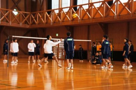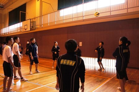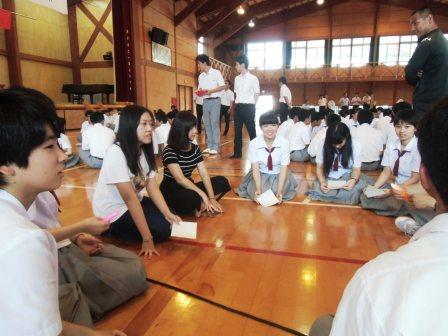 午後からは学友団活動で、ビーチボールを使ったバレーボールが行われ、中学生高校生混合のチームで試合をしました。リーダーとなった高校生は中学生との交流を深めるため、試合の後に反省会として輪になって座り「次は勝てるよ」と声をかけていたチームもありました。生徒は緊張からかなかなか試合のときも声が出ていませんでしたが、徐々に声が出始めていました。1勝もできなかったチームもありましたが、そのリーダーから「勝てませんでしたが、中学生が少しでも楽しめたみたいなのでよかった。」と笑顔で言われました。