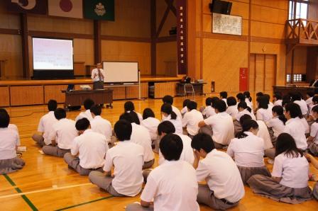 今日の放課後に、九州学院高校の高橋美行先生をお招きして、ボランティア学習会を開催しました。高橋先生から、日々の何気ないことに対する感謝の気持ちや熊本県の女子高生の心温まるエピソードなどを交えながらボランティアの心得を69名(希望者)の生徒たちは熱心に聞きいっていました。