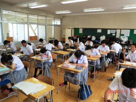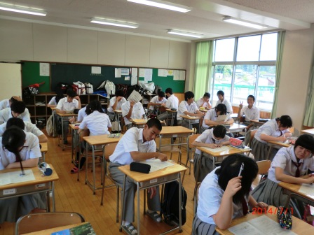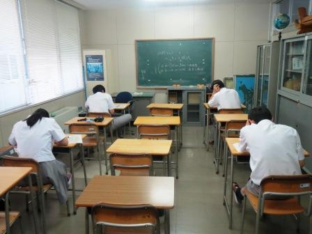 生徒たちは一生懸命問題を解いていました。期末考査は今週の金曜日まで続きます。寝不足の生徒も多くみられます。くれぐれも体調を崩さないようにしつつ、少しでも良い結果を残して欲しいと思います。