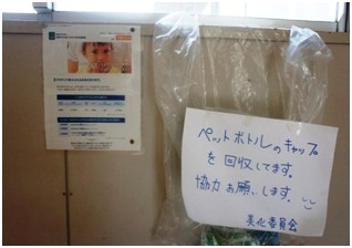 各学期末に校内をまわったり、家庭から持ちよったりしたペットボトルキャップを美化委員でシールを剥がし、洗い、乾燥させてエコキャップ推進協会に送ってます。 昨年は10kg×10袋を送ることができました