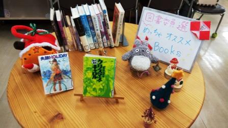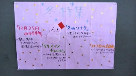 冬・クリスマスを題材にした本を集めています。1年の図書委員さんが作ってくれた特集掲示もあります。冬休みの長期貸出も行っており、本好きな生徒さんが長編を借りてくれたり、新しいジャンルに挑戦したりしてくれています。
